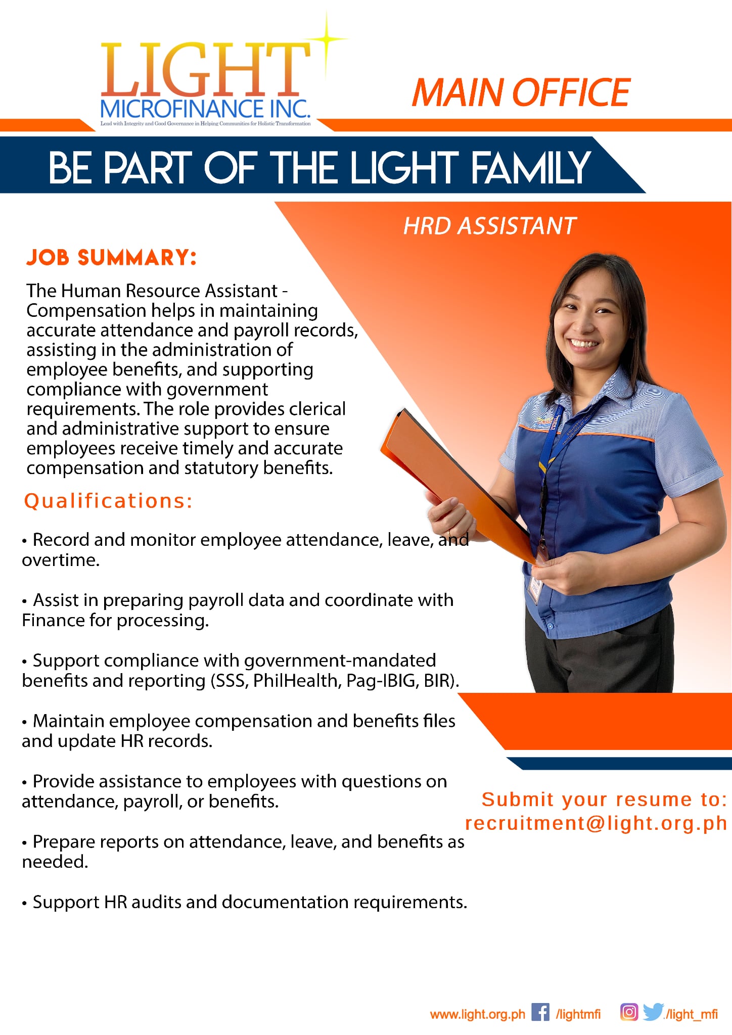 The Human Resource Assistant – Compensation helps in maintaining accurate attendance and payroll records, assisting in the administration of employee benefits, and supporting compliance with government requirements. The role provides clerical and administrative support to ensure employees receive timely and accurate compensation and statutory benefits.